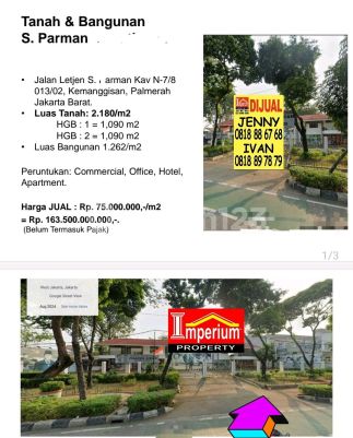 Dijual‼️ Gedung di Slipi Lt 2018m2 Lb 1262m2 Harga Rp 75 jt per m2 / Total Rp 163Milyar