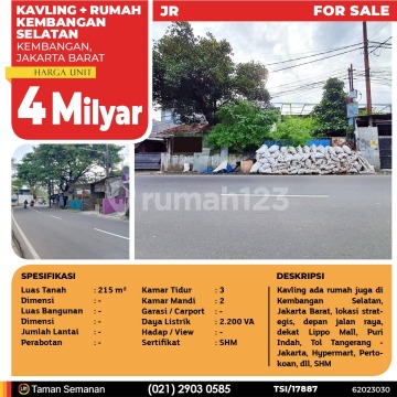 TSI/17887 For Sale Kavling + Rumah Kembangan Selatan, Jakarta Barat, 215 m², SHM Harga Rp 4.000.000.xxx Alamat Kembangan, Jakarta Barat Deskripsi Properti Kavling bonus rumah di Kembangan Selatan, Jakarta Barat, Lokasi strategis, depan jalan raya, dekat Lippo Mall Puri, Mal Puri Indah, Tol Tangerang - Jakarta, Hypermart, Pertokoan, dll, SHM Luas Tanah 215 m² Dimensi - Luas Bangunan - Dimensi - Jumlah Lantai - Perabotan - Kamar Tidur 3 Kamar Mandi 2 Garasi / Carport - Jalur Telepon - Daya Listrik 2.200 VA Hadap / View - Sertifikat SHM LJH Realty Taman Semanan