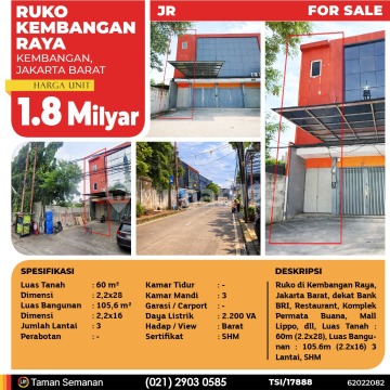TSI/17888 For Sale Ruko Kembangan Raya, Jakarta Barat, 2.2×16 m², 3 Lt, SHM Harga Rp 1.8 Milyar Alamat Kembangan, Jakarta Barat Deskripsi Properti Ruko di Kembangan Raya, Jakarta Barat, dekat Bank BRI, Restaurant, Komplek Permata Buana, Lippo Mall Puri, dll, Luas Tanah : 60m (2.2×28), Luas Bangunan : 105.6m (2.2×16) 3 Lantai, SHM Luas Tanah 60 m² Dimensi 2,2×28 Luas Bangunan 105,6 m² Dimensi 2,2×16 Jumlah Lantai 3 Perabotan - Kamar Tidur - Kamar Mandi 3 Garasi / Carport - Jalur Telepon - Daya Listrik 2.200 VA Hadap / View Barat Sertifikat SHM LJH Realty Taman Semanan