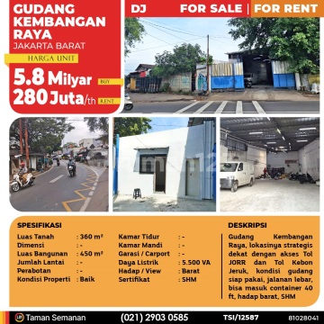TSI/12587 For Sale / For Rent Gudang Kembangan Raya, Jakarta Barat, 360 m², SHM Harga Rp 5.800.000.xxx (Buy) / Rp 280.000.xxx /th (Rent) Alamat Kembangan, Jakarta Barat Deskripsi Properti Gudang Kembangan Raya, lokasinya strategis dekat dengan akses Tol JORR dan Tol Kebon Jeruk, kondisi gudang siap pakai, jalanan lebar, bisa masuk container 40 ft, hadap barat, SHM Luas Tanah 360 m² Dimensi - Luas Bangunan 450 m² Jumlah Lantai - Perabotan - Kondisi Baik Kamar Tidur - Kamar Mandi - Garasi mobil - Jalur Telepon - Daya Listrik 5.500 VA Hadap / View Barat Sertifikat SHM LJH Realty Taman Semanan Property Help ✆ 0212903xxxx