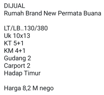 DIJUAL Rumah Brand New Permata Buana LT/LB..130/380 Uk 10x13 KT 5+1 KM 4+1 Gudang 2 Carport 2 Hadap Timur Harga 8,2 M nego