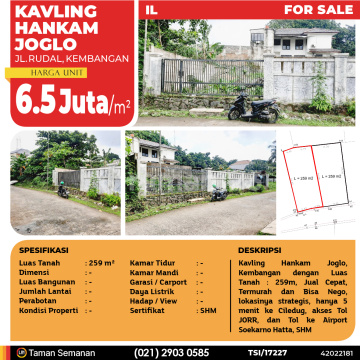 TSI/17227 For Sale Kavling Hankam Joglo, Kembangan, 259 m², SHM Harga Rp 6.5 Juta /m² (Nego) Alamat Jl. Rudal, Kembangan Deskripsi Properti Kavling Hankam Joglo, Kembangan dengan Luas Tanah : 259m, Jual Cepat, Termurah dan Bisa Nego, lokasinya strategis, hanya 5 menit ke Ciledug, akses Tol JORR, dan Tol ke Airport Soekarno Hatta, SHM Luas Tanah 259 m² Dimensi - Luas Bangunan - Jumlah Lantai - Perabotan - Kondisi - Kamar Tidur - Kamar Mandi - Garasi / Carport - Jalur Telepon - Daya Listrik - Hadap / View - Sertifikat SHM LJH Realty Taman Semanan Property Help ✆ 0212903xxxx