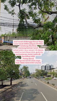 Jual tanah di Mangga Besar Raya Luas tanah 698m (depan 16x45m belakang 18x45m) Kantong bentuk tanah Lokasi jalan raya sangat strategis, cocok untuk showroom, gedung perkantoran, hotel, bank dll. Sertifikat HGB Hadap Barat Harga murah 50 Jt/m nego Hub: 08569293xxxxYanti)