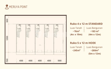 Unit E&F ( Hoek dan Samping): LT 245 (5 x 19) LB 260 (5 x 12) Harga Cash Rp 6,926,176,125 Harga KPR Rp 7,157,048,663 Tersedia unit non Hoek: Unit ABCD: LT 76 (4 x 19) LB 183 (4 x 12) Harga Cash Rp 2,933,974,000 Harga KPR Rp 3,030,7393,800