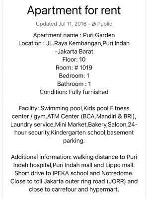 Disewakan Apartemen Puri Garden Jalan raya kembangan, puri indah Jakarta barat Luas 45 meter Kt 1 Km 1 Lantai 10 Furnished Harga 45 juta Deposit 5 juta
