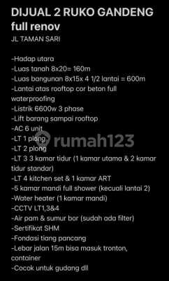 DIJUAL RUKO GANDENG 4½ LANTAI FULL RENOVASI DI TAMAN SARI - Jakarta Barat LT (8 x 20) 160 m² / LB 600 m² KT 3 + 1 / KM 5 Listrik 6600 W SHM Hadap Utara Ada Lift Barang Full Renovasi (Ac 6 unit, Kitchen Set, Dll) Row Jalan 15 Mtr Masuk Tronton/Kontainer *Harga Rp. 12.9 M (Nego) Hub : Olla/0822xxxxxxxx ********
