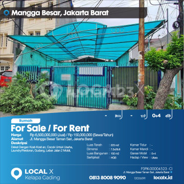 Dekat Dengan Kost-Kost an, Cocok Untuk Usaha, Laundry/Restoran, Gudang, Lebar Jalan 2 Mobil, For Sale / For Rent - Jual / Sewa Rumah Jl. Mangga Besar Taman Sari, Jakarta Barat Harga. Rp 650000xxxxJual) / Rp 15000xxxxSewa/Tahun) Deskripsi Properti. Dekat Dengan Kost-Kost an, Cocok Untuk Usaha, Laundry/Restoran, Gudang, Lebar Jalan 2 Mobil, Luas Tanah. 223 m2 Dimensi. 7.5x29.8 Luas Bangunan. 150 m2 Sertipikat. HGB Kamar Tidur. - Kamar Mandi. - Garasi Mobil. 0+4 Hadap / View. Utara LOCAL X Kelapa Gading ******** ⓪⑧①③⑧⓪⓪⑧⑨⓪⑨⓪ P3PIK-0000xxxx-CI-J/S