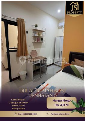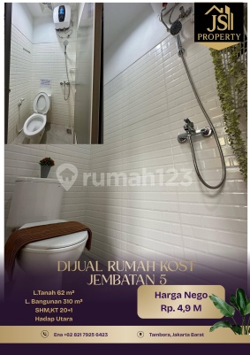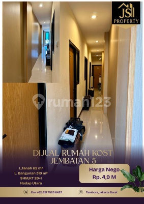 DIJUAL RUMAH KOST 5 Lantai di Jembatan 5 Tambora - Jakarta Barat Luas Tanah 62 m² Dimensi 4x20 m² Luas Bangunan 319 m² 5 Lantai Kamar Tidur 20 + 1 ART Kamar Mandi 20+1 Full Furnish Listrik @1.300kwh/kmr Air Pam Sertifikat SHM Hadap Utara Hal yang Menarik : - Bebas Banjir - Investasi jangka panjang - ROI Tertinggi 11% Jakbar - Area Perkantoran,Kuliner,Mall - Kost Premium Harga 4,9 M Nego