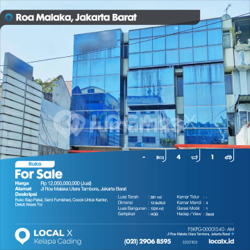 Ruko Siap Pakai, Semi Furnished, Cocok Untuk Kantor, Dekat Akses Tol For Sale - Jual Ruko Jl Roa Malaka Utara Tambora, Jakarta Barat Harga. Rp 1200000xxxxJual) Deskripsi Properti. Ruko Siap Pakai, Semi Furnished, Cocok Untuk Kantor, Dekat Akses Tol Luas Tanah. 381 m2 Dimensi. 12.9x26.8 Luas Bangunan. 1524 m2 Sertipikat. HGB Kamar Tidur. - Kamar Mandi. 4 Garasi Mobil. 1 Hadap / View. Barat LOCAL X Kelapa Gading ******** ⓪②① ②⑨⓪⑥ ⑧⑤⑨⑤ P3KPG-0000xxxx-AM-J