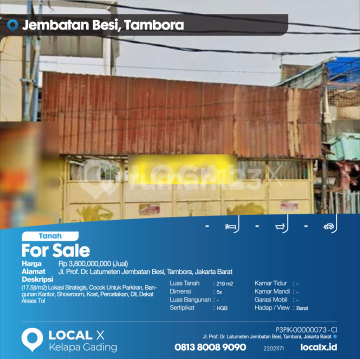 (Rp17.5jt/m2) Lokasi Strategis, Cocok Untuk Parkiran, Bangunan Kantor, Showroom, Kost, Percetakan, Dll, Dekat Akses Tol For Sale - Jual Tanah Jl. Prof. Dr. Latumeten Jembatan Besi, Tambora, Jakarta Barat Harga. Rp 3,800,000,000 (Jual) Deskripsi Properti. (Rp17.5jt/m2) Lokasi Strategis, Cocok Untuk Parkiran, Bangunan Kantor, Showroom, Kost, Percetakan, Dll, Dekat Akses Tol Luas Tanah. 219 m2 Dimensi. 5x Luas Bangunan. 219 m2 Sertipikat. HGB Kamar Tidur. - Kamar Mandi. - Garasi Mobil. - Hadap / View. Barat LOCAL X Kelapa Gading ******** ⓪⑧①③⑧⓪⓪⑧⑨⓪⑨⓪ P3PIK-0000xxxx-CI-J