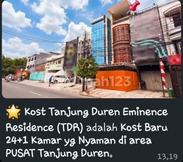 KOST 24 KAMAR "TANJUNG DUREN EMINENCE RESIDENCE" JL. TJ. DUREN RAYA, JAKARTA BARAT KOST BARU RENOV TOTAL dan sdh FULL terisi 90-100% ROI TINGGI 8-10%/ Tahun OCCUPANCY MANTAP SPESIFIKASI : - SHM+IMB - LT: 111 m² (4x28) - LB: 346 m² - 4 Lantai - 24 K. Tidur + K. Mandi (water heater) + Token Listrik 1.300 watt - 1 Kmr ART + K. Mandi - Hadap: Barat - Lebar Jalan 2 MOBIL - Listrik Utama: 7.700 Watt - Air PAM Ready + Air Sumur (yg skrg dipakai) STRATEGIS, ±3-7 menit ke : - Mall: Neo Soho, CP, TA & CL - Univ: Untar, Ukrida, Trisakti & Esa Unggul - RS: Royal Taruma, Sumber Waras & Graha Kedoya - Halte Trans Jakarta: Central Park HARGA SEWA KAMAR: - Type Royal 2,3 Juta - Premium Plus 2,6 Juta - Orang ke-2, tambah Rp 400.000/ bln. FASILITAS: - Bangunan Baru FULL Granit 120x60cm dan 60x60cm - 2 Area Bersama (R.Tamu + Roof Top dining area) - Android Smart TV 32 Inchi - Panel Kayu Elegan & Cermin besar tiap Kamar - Router WIFI Personal - Fasilitas Kmr Lengkap + Furniture BARU - Internet Super Cepat dgn Sistem Mikrotik seperti HOTEL - Token Listrik tiap Kamar - Dispenser Air otomatis Tiap Lantai - Dapur Lengkap dgn Kulkas, Microwave dan Peralatan Masak lainnya - 24 Jam CCTV HIK Vision - Ready Mesin Cuci utk Laundry NET INCOME Rp 53.5 Juta/ bln atau Rp 642 Jt bersih/ tahun PLUS Potensi *Tambahan Income Rp 2.4 Juta/ bln* jika Kamar dihuni berdua (6 x 400rb) . OW.01.26.AND . .
