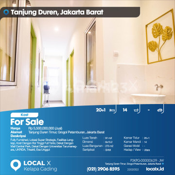 Fully Furnished, Lokasi Super Strategis, Fasilitas Lengkap, Kost Dengan Roi Tinggi Full Terisi, Dekat Dengan Mall Central Park, Dekat Dengan Universitas Tarumanegara, UKRIDA, Trisakti, Esa Unggul For Sale - Jual Kost Tanjung Duren Timur, Grogol Petamburan, Jakarta Barat Harga. Rp 550000xxxxJual) Deskripsi Properti. Fully Furnished, Lokasi Super Strategis, Fasilitas Lengkap, Kost Dengan Roi Tinggi Full Terisi, Dekat Dengan Mall Central Park, Dekat Dengan Universitas Tarumanegara, UKRIDA, Trisakti, Esa Unggul Luas Tanah. 91 m2 Dimensi. 6x15.2 Luas Bangunan. 275 m2 Sertipikat. SHM Kamar Tidur. 20+1 Kamar Mandi. 14 Garasi Mobil. - Hadap / View. Utara LOCAL X Kelapa Gading ******** ⓪②① ②⑨⓪⑥ ⑧⑤⑨⑤ P3KPG-0000xxxx-JW-J