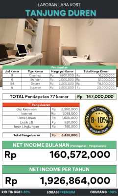 ARANG ADA...Kost di TANJUNG DUREN yg Dekat Kampus & Mall yg Dekat Kampus dan Kantor. Dekat dengan 2 KAMPUS (Untar, Trisaksi) dan 4 MALL (NEO Soho, Central Park, Taman Anggrek dan CitraLand) KOST DG ROI TINGGI 8-10%/ Tahun TOTAL ada 77 KMR TIDUR Fully Furnished DIJUAL CEPAT 24M nego Kost TANJUNG DUREN RESIDENCE # Spesifikasi Property : # SHM+ IMB (RUMAH KOST) Konstruksi Besi WF 500 LT: 200 m2 (10 x 200 m) LB: 1100 m2 (6 lantai) 77 Kamar 77 Kamar Mandi dgn Water Heater 1 unit Lift Schindler Hadap : Utara Lewat Mobil 77 Token Listrik Kamar 1.300 Watt 1 Token Utama 5.500 Watt 1 Token Lift 10.600 Watt # LOKASI SUPER STRATEGIS Dekat ke : Kampus : Untar, Ukrida, Trisakti dan Esa Unggul Mall : Neo Soho, Central Park, Taman Anggrek dan Citra Land Rumah Sakit] : Royal Taruma, Sumber Waras dan Graha Kedoya Halte Busway : Central Park CP INFO Harga Sewa Kamar Harga Kamar tipe Standar 2.2 Juta hingga Deluxe 2.5 Juta Semua Fasilitas LENGKAP DISUKAI Penghuni dan SUPER EFISIEN untuk Owner Kos, yaitu: 1. Bangunan Kost dgn FULL Niro Granit Tile 60x60cm 2. Kamar Mandi Dalam + Water Heater 3. Ada 2 Area Bersama Sangat Penting bagi Anak Kos untuk bisa kerja dan produktif di Kos, yaitu dan Roof Top Study Area & Rooftop Kitchen 4. Panel Kayu Elegan dan Cermin besar di setiap kamar 5. Fasilitas Kamar Lengkap + Furniture JAPANESE DESIGN Spring Bed King Koil - Mattress Protector Lemari Baju - AC - Jendala - Gorden Kursi Scandinavian - Meja Belajar - Panel + Cermin Rak Sepatu 7. Internet Super Cepat dgn Sistem Private Access seperti HOTEL 8. Token Listrik tiap Kamar 9. Dispenser Air Otomatis Air Minum GRATIS utk Anak kos dgn Sistem Filter RO (Reverse Osmosis). Kost bebas Galon dan hemat biaya bagi Owner. 10. Dapur Lengkap dgn Kulkas, Microwave dan Peralatan Masak lainnya 11. 24 Jam CCTV HIK Vision OCCUPANCY MANTAAP KOS Berjalan 1 tahun + Furniture & Bangunan Like New Occupancy selalu FULL 100% Tinggal di Lanjutkaaan NET INCOME Rp 160 Juta / bln atau Rp 1.92 Milyar / tahun DIJUAL CEPAT 24 M nego ROI 8-10% / TAHUN