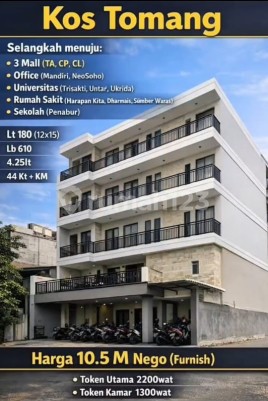 Dijual Rumah Kost Strategis Bebas Banjir Murah di Tomang Posisi Sedang Dalam Proses Pembangunan Estimasi Selesai Juli 2027 Harga Perdana LT 180M(12x15) LB 610 (4.5lantai) KT 44 KM 44 Kitchen ada 2 Ruang Serba Guna ada 2 SHM Hadap Barat Daya (kena Tusuk Sate Bagus Untuk Bisnis) Estimasi Rev 90juta/bulan LIstrik Token Utama 2200W Listrik Token Perkamar 1300W ROI >11% Harga 10.5M nego (furnish)