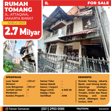 TSI/17374 For Sale Rumah Tomang, Jakarta Barat, 150 m², 2 Lt, SHM Harga Rp 2.7 Milyar Alamat Jl. Attaqwa, Jakarta Barat Deskripsi Properti Rumah Tomang, Jakarta Barat, Jual hitung tanah, lokasinya strategis, dekat dengan kampus Trisakti, Untar dan Pasar Tomang, unit cocok untuk dibangun kost-kostan, SHM Luas Tanah 150 m² Dimensi - Luas Bangunan 250 m² Jumlah Lantai 2 Perabotan - Kondisi - Kamar Tidur - Kamar Mandi - Garasi / Carport - Jalur Telepon - Daya Listrik 6.600 VA Hadap / View - Sertifikat SHM LJH Realty Taman Semanan Property Help ✆ 0212903xxxx