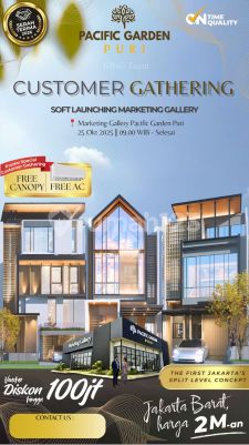 PACIFIC GARDEN PURI - Hunian Mewah, Investasi Cerdas di Jakarta Barat! Rasakan sensasi tinggal di rumah modern berkonsep Split Level pertama di Jakarta Barat, dengan desain tanpa koridor yang membuat ruangan terasa lega, nyaman, dan berkelas. Dilengkapi Club House super luas untuk gaya hidup eksklusif keluarga Anda. Harga mulai 2 M-an Lokasi strategis: hanya 6 menit ke Tol Meruya, RSPI Puri, & Lippo Mall Puri Pilihan Tipe: 5,5x11 -> 5 KT, 4 KM 6x11 -> 5 KT + Attic Room, 4 KM 8x12 -> 6+1 KT + Attic Room, 5 KM Fasilitas Premium: Sport Club 2.000 m² - Swimming Pool - Gym - Hall - Garden - Area Komersil - Taman Bermain Anak Promo Customer Gathering: Free Canopy Free AC Voucher Diskon hingga 100 Juta Soft Launching Marketing Gallery - 25 Oktober 2025 Hubungi Nanda - 08571870xxxx Unit terbatas! Jangan tunggu nanti, karena hunian terbaik selalu cepat terjual.