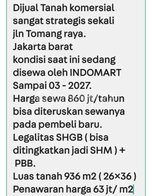 Dijual tanah komersial sangat strategis sekali " Tomang Raya"Jakarta Barat Luas tanah: 936 M2 (26x36) SHGB Harga: 63 juta/meter Saat ini sedang disewa oleh indomaret sampai denga Maret 2027 Harga sewa 860 juta/ tahun Bisa diteruskan sewanya ke pembeli baru Legalitas SHGB ( bisa ditingkatkan ke SHM)+ PBB