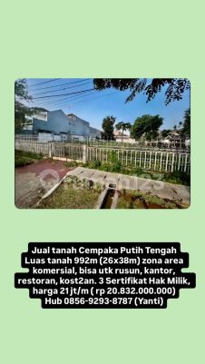 Jual tanah Cempaka Putih Tengah Luas tanah 992m (26x38m) Zona area komersial, bisa utk rusun, kantor, restoran, kost2an. 3 Sertifikat Hak Milik, harga 21 jt/m ( rp 2083200xxxx Hub 08569293xxxxYanti)