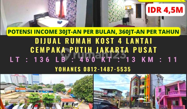 "Nego Sampai Jadi Akan Di Bantu" untuk owner Kost yang mau diskusi cara meningkatkan Occupancy, OMSET Kost dan bisnisnya AUTOPILOT silahkan japri Wa ya menyediakan juga jasa untuk konstruksi pembangunan Kost yang berpengalaman Alokasikan Deposito anda dan dapatkan penghasilan rutin bulanan mau cari investasi Kost daerah Jakarta dan Sekitarnya bisa banget Siap membantu dalam titip jual dan Beli Rumah KOST / Kontrakan Butuh Uang , Jual Cepat Jual 4,5M pas SHM Luas tanah 136 Luas bangunan 400 4 lantai Total kamar : 13 kamar tidur 11 kamar mandi Lantai 1 : 2 kamar tidur 2 kamar mandi Lantai 2 : 4 kamar tidur 4 kamar mandi Lantai 3 : 4 kamar tidur 4 kamar mandi Lantai 4 : 3 kamar tidur 1 kamar mandi Fasilitas : Ac, Carport, Pam, Water Heater Tarif kamar sendiri 2jt, berdua 2.2jt Akses jalan 2 mobil longgar Lokasi strategis dekat ITC CEMPAKA, Univ Yarsi, Cempaka putih akses lokasi dekat Senen, Kemayoran, Kelapa Gading, Sunter, Utan Kayu, Menteng, Pramuka, Rawamangun, Pulomas Dan kalian juga bisa tanya-tanya seputar : - Titip Jual dan Beli Property - Desain interior + Furniture - Pembiayaan Bank KPR / Refinancing