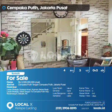 Lokasi Strategis, Suasana Aman, Nyaman, Bebas Banjir, Lokasi Strategis, Dekat Dengan Tol Cempaka Putih Atau Rawamangun, Sekolah, RS For Sale - Jual Rumah Cempaka Putih Tengah Cempaka Putih, Jakarta Pusat Harga. Rp 300000xxxxJual) Deskripsi Properti. Lokasi Strategis, Suasana Aman, Nyaman, Bebas Banjir, Lokasi Strategis, Dekat Dengan Tol Cempaka Putih Atau Rawamangun, Sekolah, RS Luas Tanah. 96 m2 Dimensi. 6x16 Luas Bangunan. 130 m2 Sertipikat. SHM Kamar Tidur. 4 Kamar Mandi. 3 Garasi Mobil. 0+2 Hadap / View. Utara LOCAL X Kelapa Gading ******** ⓪②① ②⑨⓪⑥ ⑧⑤⑨⑤ P3KPG-0000xxxx-ZZ-J
