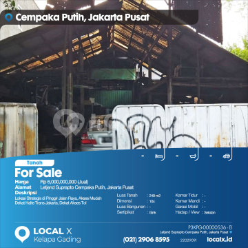 Lokasi Strategis di Pinggir Jalan Raya, Akses Mudah Dekat Halte Trans Jakarta, Dekat Akses Tol For Sale - Jual Tanah Letjend Suprapto Cempaka Putih, Jakarta Pusat Harga. Rp 6,000,000,000 (Jual) Deskripsi Properti. Lokasi Strategis di Pinggir Jalan Raya, Akses Mudah Dekat Halte Trans Jakarta, Dekat Akses Tol Luas Tanah. 249 m2 Dimensi. 10x Luas Bangunan. 249 m2 Sertipikat. Girik Kamar Tidur. - Kamar Mandi. - Garasi Mobil. - Hadap / View. Selatan LOCAL X Kelapa Gading ******** ⓪②① ②⑨⓪⑥ ⑧⑤⑨⑤ P3KPG-0000xxxx-EI-J