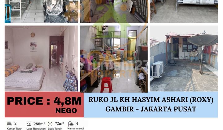 Dijual Ruko Jl KH Hasyim Ashari (Roxy), Gambir - Jakarta Pusat 4 Lantai Luas Tanah : 72m² Uk 4x18 Luas Bangunan : 288m² 2 Kamar Tidur 4 Kamar Mandi (setiap lantai) Air PAM Listrik 3.300 watt Hadap Utara HGB Harga 4,8M Nego Kim's One Property Wa.me/6281898xxxx One Property Rukan Sentra Niaga Blok N 27 Lt 3. Green Lake City - Jakarta Barat onepropertyglc@******** +62813xxxxxxxx