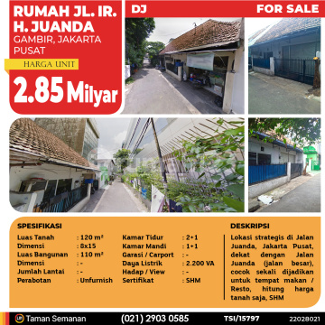 TSI/15797 For Sale Rumah Jl. Ir. H. Juanda, Jakarta Pusat, 8x15 m², SHM Harga Rp 2.85 Milyar Alamat Gambir, Jakarta Pusat Deskripsi Properti Lokasi strategis di Jalan Juanda, Jakarta Pusat, dekat dengan Jalan Juanda (jalan besar), cocok sekali dijadikan untuk tempat makan / Resto, hitung harga tanah saja, SHM Luas Tanah 120 m² Dimensi 8x15 Luas Bangunan 110 m² Dimensi - Jumlah Lantai - Perabotan Unfurnish Kamar Tidur 2+1 Kamar Mandi 1+1 Garasi mobil - Jalur Telepon - Daya Listrik 2.200 VA Hadap / View - Sertifikat SHM LJH Realty Taman Semanan Property Help ✆ 0212903xxxx