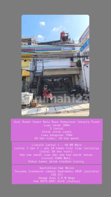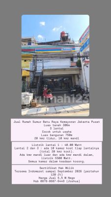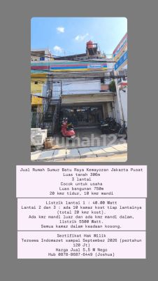 Jual Rumah Sumur Batu Raya Kemayoran Jakarta Pusat Luas tanah 306m 3 lantai Cocok untuk usaha Luas bangunan 750m 20 kmr tidur, 10 kmr mandi Listrik lantai 1 : 40.00 Watt Lantai 2 dan 3 : ada 10 kamar kost tiap lantainya (total 20 kmr kost). Ada kmr mandi luar dan ada kmr mandi dalam, listrik 5500 Watt. Semua kamar dalam keadaan kosong. Sertifikat Hak Milik Tersewa Indomaret sampai September 2026 (pertahun 120 Jt) Harga Jual 5,5 M Nego Hub 0878xxxxxxxxJoshua)