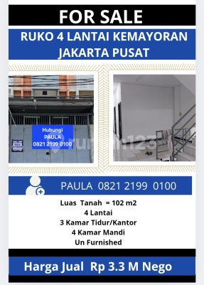 Ruko 4 Lantai Kalibaru Jakarta Pusat Hubungi Paula 0821xxxxxxxx Ruko ini menawarkan kelengkapan fasilitas serta memiliki nilai tepat yang siap untuk segera Anda miliki. Kondisi detail properti sebagai berikut: Luas Tanah = 102 m2 L Bangunan = 350 m2 3 Kamar Tidur 4 Kamar Mandi 4 Lantai Bisa KPR SHM - Sertifikat Hak Milik Unfurnished Tidak hanya itu, properti ini memiliki keunggulan sebagai berikut: Lokasi di Pusat Kota. Cocok Untuk Investasi. Cocok Untuk Dijual Kembali. Properti Bisa Nego. Akses Jalan Muat 2 Mobil. Lokasi Strategis. Lokasi Bebas Banjir. Lokasi Strategis terletak di Kemayoran, properti ini memudahkan akses Anda ke fasilitas-fasilitas utama Harga Jual Rp 3.3 M Nego, ruko ini siap menjadi milik Anda!