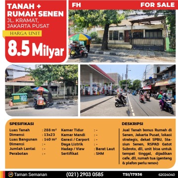 TSI/17936 For Sale Tanah + Rumah Senen, Jakarta Pusat, 13×23 m², SHM Harga Rp 8.500.000.xxx Alamat Jl. Kramat IV, Jakarta Pusat Deskripsi Properti Jual Tanah bonus Rumah di Senen, Jakarta Pusat, lokasi strategis, dekat SPBU, Stasiun Senen, RSPAD Gatot Subroto, dll, unit bisa untuk tempat tinggal, dijadikan cafe, dll, rumah tua (genteng & plafon perlu renovasi) Luas Tanah 288 m² Dimensi 13×23 Luas Bangunan 140 m² Dimensi - Jumlah Lantai - Perabotan - Kamar Tidur - Kamar Mandi - Garasi / Carport - Jalur Telepon - Daya Listrik - Hadap / View Barat Laut Sertifikat SHM LJH Realty Taman Semanan