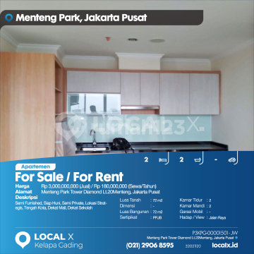Semi Furnished, Siap Huni, Semi Private, Lokasi Strategis, Tengah Kota, Dekat Mall, Dekat Sekolah For Sale / For Rent - Jual / Sewa Apartemen Menteng Park Tower Diamond Lt.20Menteng, Jakarta Pusat Harga. Rp 300000xxxxJual) / Rp 18000xxxxSewa/Tahun) Deskripsi Properti. Semi Furnished, Siap Huni, Semi Private, Lokasi Strategis, Tengah Kota, Dekat Mall, Dekat Sekolah Luas Tanah. 72 m2 Dimensi. - Luas Bangunan. 72 m2 Sertipikat. PPJB Kamar Tidur. 2 Kamar Mandi. 2 Garasi Mobil. - Hadap / View. Jalan Raya LOCAL X Kelapa Gading ******** ⓪②① ②⑨⓪⑥ ⑧⑤⑨⑤ P3KPG-0000xxxx-JW-J/S