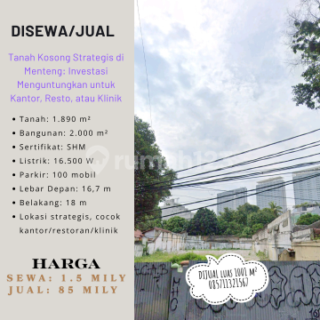 FOR SALE / RENT : TANAH KOSONG AREA KOMERSIAL JL SOEROSO MENTENG Spesifikasi : LT. 1001 Lebar Depan : 16,7 meter Lebar Belakang : 18 meter Lokasi : Strategis Cocok untuk : Kantor, Resto, klinik Dll