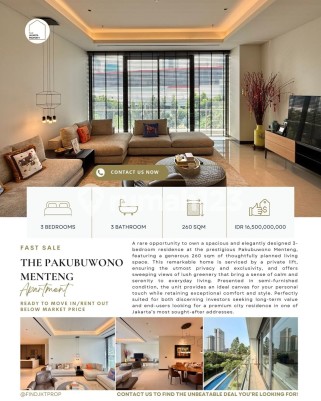 FAST SALE THE PAKUBUWONO MENTENG A rare opportunity to own a spacious and elegantly designed 3-bedroom residence at the prestigious Pakubuwono Menteng, offering a generous 260 sqm of thoughtfully planned living space. This remarkable home is serviced by a private lift, ensuring the utmost privacy and exclusivity, and boasts sweeping views of lush greenery that bring a sense of calm and serenity to everyday living. Presented in semi-furnished condition, the residence offers an ideal canvas for personalization while retaining exceptional comfort and timeless elegance. Perfectly suited for discerning investors seeking long-term value or end-users looking for a premium city residence in one of Jakarta’s most sought-after addresses, this unit stands out for its rare availability and competitive pricing. Residents of Pakubuwono Menteng enjoy world-class facilities, including multiple swimming pools, a fully equipped gym, spa, tennis court, children’s playground, landscaped gardens, and 24-hour security for complete peace of mind. BEST PRICE GUARANTEED – READY TO MOVE IN (RARELY AVAILABLE). Don’t miss out on this limited opportunity—contact us today to schedule a viewing and secure this remarkable unit before it’s gone. +62819xxxxxxxx