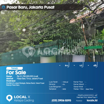 (Rp30jt/m²) Lokasi Strategis, Bebas Banjir, Dekat Pusat Belanja Pasar Baru For Sale - Jual Tanah Pasar Baru Timur, Jakarta Pusat Harga. Rp 51,780,000,000 (Jual) Deskripsi Properti. (Rp30jt/m²) Lokasi Strategis, Bebas Banjir, Dekat Pusat Belanja Pasar Baru Luas Tanah. 1726 m2 Dimensi. 47x Luas Bangunan. 1726 m2 Sertipikat. SHM Kamar Tidur. - Kamar Mandi. - Garasi Mobil. - Hadap / View. Utara-Timur LOCAL X Kelapa Gading ******** ⓪②① ②⑨⓪⑥ ⑧⑤⑨⑤ Whatsapp/Call. Mariana - ⓪⑧①⑥④⑧③⓪⑤⑤⓪ P3KPG-0000xxxx-MT-J