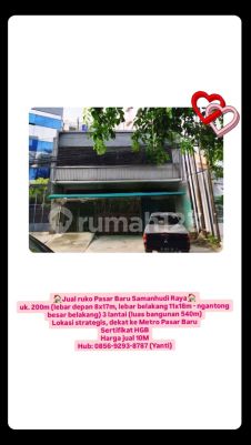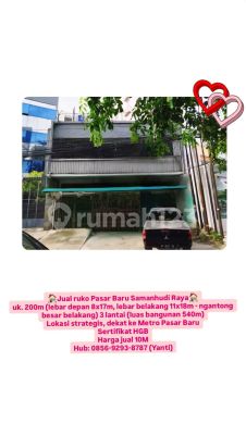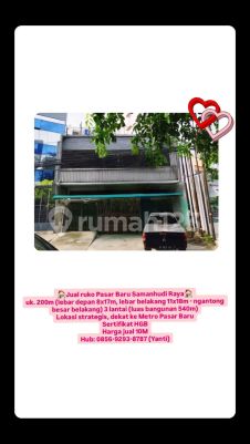Jual ruko Pasar Baru Samanhudi Raya uk. 200m (lebar depan 8x17m, lebar belakang 11x18m - ngantong besar belakang) 3 lantai (luas bangunan 540m) Lokasi strategis, dekat ke Metro Pasar Baru Sertifikat HGB Harga jual 10M Hub: 08569293xxxxYanti)