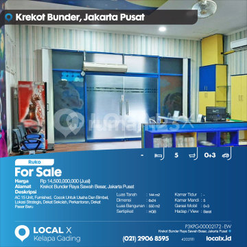 AC 15 Unit, Furnished, Cocok Untuk Usaha Dan Bimbel, Lokasi Strategis, Dekat Sekolah, Perkantoran, Dekat Pasar Baru For Sale - Jual Ruko Krekot Bunder Raya Sawah Besar, Jakarta Pusat Harga. Rp 1450000xxxxJual) Deskripsi Properti. AC 15 Unit, Furnished, Cocok Untuk Usaha Dan Bimbel, Lokasi Strategis, Dekat Sekolah, Perkantoran, Dekat Pasar Baru Luas Tanah. 144 m2 Dimensi. 6x24 Luas Bangunan. 550 m2 Sertipikat. HGB Kamar Tidur. - Kamar Mandi. 5 Garasi Mobil. 0+3 Hadap / View. Barat LOCAL X Kelapa Gading ******** ⓪②① ②⑨⓪⑥ ⑧⑤⑨⑤ P3KPG-0000xxxx-EW-J