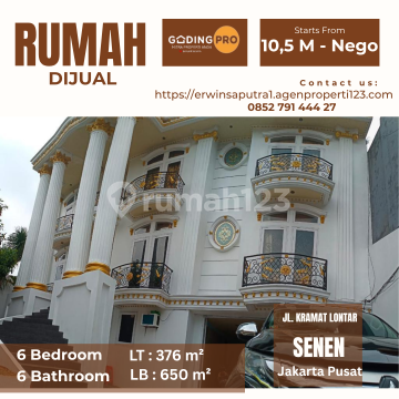 Dijual Cepat Harga Nego Sampai Deal !!! Rumah Jl. Kramat lontar Senen Jakarta Pusat - Luas Tanah : 376 m² - Luas Bangunan : -+ 650 m² - 3 lantai - Kamar Tidur : 7 - Kamar Mandi : 7 - SHM , PBB , IMB Lengkap - furnished - Listrik 6600 watt - Hadap timur - Pinggir jalan, Bisa 2-3 mobil - Bebas banjir - Aman Harga 13,5 M cash / KPR dibantu (Harga Nego ampe jadi Setelah Survey ) Turun Harga Jadi 10,5 M - Masih Nego list by : onrnjwaonr