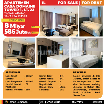 TSI/17376 For Sale / For Rent Apartemen Casa Domaine, Tower 1, Jakarta Pusat, 168 m², Lt. 22, SHM Harga Rp 8 Milyar (Buy) / Rp 586 Juta /th (Rent) Alamat Tanah Abang, Jakarta Pusat Deskripsi Properti Lokasi strategis di CBD Jakarta, direct access to KH Mansyur and Jl. Jendral Sudirman, walking distance to Dukuh Atas Interchange, Swimming Pool, Children Pool, Sauna, Spa Luas Tanah 168 m² Dimensi - Luas Bangunan 168 m² Jumlah Lantai 22 Perabotan - Kondisi Baik Kamar Tidur 3+1 Kamar Mandi 2+1 Garasi / Carport - Jalur Telepon - Daya Listrik - Hadap / View Utara Sertifikat SHM LJH Realty Taman Semanan Property Help ✆ 0212903xxxx