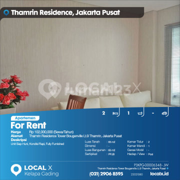 Unit Siap Huni, Kondisi Rapi, Fully Furnished For Rent - Sewa Apartemen Thamrin Residence Tower Bougenville Lt.9 Thamrin, Jakarta Pusat Harga. Rp 102,000,000 (Sewa/Tahun) Deskripsi Properti. Unit Siap Huni, Kondisi Rapi, Fully Furnished Luas Tanah. 65 m2 Dimensi. - Luas Bangunan. 65 m2 Sertipikat. PPJB Kamar Tidur. 2 Kamar Mandi. 1 Garasi Mobil. - Hadap / View. Pool LOCAL X Kelapa Gading ******** ⓪②① ②⑨⓪⑥ ⑧⑤⑨⑤ P3KPG-0000xxxx-JW-S
