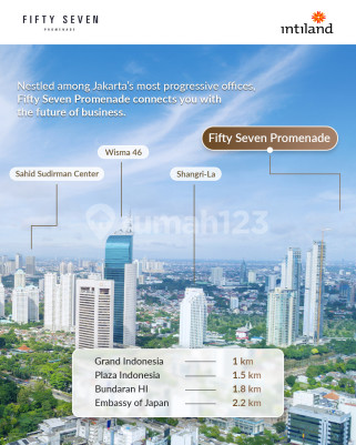 JUAL STUDIO APARTEMEN 57 PROMENADE FIFTY SEVEN PROMENADE THAMRIN JAKARTA PUSAT Tipe Studio Luas 38.84 City View Unit Ready 1 Kamar Tidur 1 Kamar Mandi Fully Furnished Fasilitas : Gym, Grocery, Al fresco, Sky Garden, Jogging Track, Yoga Corner, Function Room, Health & beauty, Sky Bridge Area, Disable Friendly, Children Playground, Cooking Class Room, Residence private drop off, SUMIBI JAPANESE AUTHENTIC Resto, Entertainment Area (Billiard, Dart), Semi Outdoor Pool + Kids Pool (skybridge), Spa & Sauna, Jacuzzi, Library & Business Center Lokasi Thamrin Sudirman Jakarta HARGA MULAI 2.8M HANYA YANG SERIUS HUBUNGI ARIF S