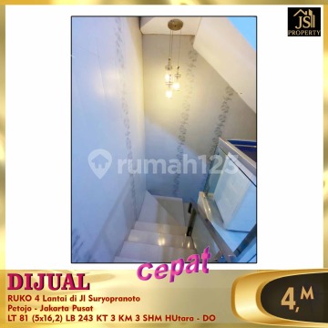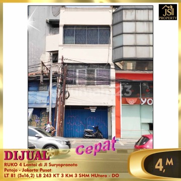 DIJUAL RUKO 4 Lantai di Jl Suryopranoto Petojo - Jakarta Pusat Bisa untuk Perkantoran, Kos2an, Jualan on line strategis di jalan raya utama Suryopranoto Luas Tanah 81 m² Dimensi 5 x 16 2 m Luas Bangunan 243 m² 4 Lantai. Lantai 4 rooftop Kamar Tidur 3 Kamar Mandi 3 Listrik 5.500 Watt Air PAM Sertifikat SHM Hadap Utara Harga 4 M Nego - DO