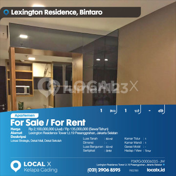 Lokasi Strategis, Dekat Mall, Dekat Sekolah For Sale / For Rent - Jual / Sewa Apartemen Lexington Residence Tower Lt.19 Pesanggrahan, Jakarta Selatan Harga. Rp 210000xxxxJual) / Rp 13500xxxxSewa/Tahun) Deskripsi Properti. Lokasi Strategis, Dekat Mall, Dekat Sekolah Luas Tanah. 53 m2 Dimensi. - Luas Bangunan. 53 m2 Sertipikat. SHM Kamar Tidur. 1 Kamar Mandi. 1 Garasi Mobil. - Hadap / View. Timur LOCAL X Kelapa Gading ******** ⓪②① ②⑨⓪⑥ ⑧⑤⑨⑤ P3KPG-0000xxxx-JW-J/S