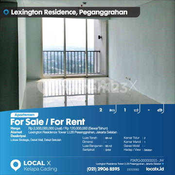 Lokasi Strategis, Dekat Mall, Dekat Sekolah For Sale / For Rent - Jual / Sewa Apartemen Lexington Residence Tower Lt.28 Pesanggrahan, Jakarta Selatan Harga. Rp 250000xxxxJual) / Rp 12000xxxxSewa/Tahun) Deskripsi Properti. Lokasi Strategis, Dekat Mall, Dekat Sekolah Luas Tanah. 88 m2 Dimensi. - Luas Bangunan. 88 m2 Sertipikat. SHM Kamar Tidur. 2 Kamar Mandi. 1 Garasi Mobil. - Hadap / View. Selatan LOCAL X Kelapa Gading ******** ⓪②① ②⑨⓪⑥ ⑧⑤⑨⑤ P3KPG-0000xxxx-JW-J/S
