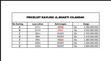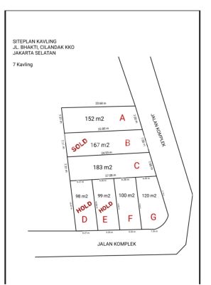 Dijual Tanah Kavling Murah Siap Bangun Di Cilandak KKO Jakarta Selatan Selling Point : - Dekat Ke Transmart Cilandak - Dekat Ke Transjakarta Ragunan - Dekat Ke Mrt Fatmawati - Dekat Ke Mall Cilandak Town Square - Dekat Ke Tol Jorr TB Simatupang - Dekat Ke Transportasi Umum - Dekat Ke Sekolah Internasional - Dekat Ke Rumah Sakit Marinir dan Pasar Minggu - Security 24 Jam - Akses 2 Mobil - Row Jalan 6 Meter - Lokasi Aman, Tenang, Bebas Banjir Kav A Luas Tanah 152 m² Panjang 22,80 m² Lebar 7,00 m² Kav C Luas Tanah 183 m² Panjang 27,08 m² Lebar 7,00 m² Kav D Luas Tanah 98 m² Panjang 14,47 m² Lebar 6,27 m² Kav E Luas Tanah 99 m² Panjang 14,66 m² Lebar 6,26 m² Kav F Luas Tanah 100 m² Panjang 14,86 m² Lebar 6,26 m² Kav G Luas Tanah 120 m² Panjang 15,06 m² Lebar 7,26 m² Harga 15.000.000/m (Nego) - Legalitas Lengkap - SHM,IMB,PBB - Sertifikat Sudah Pecah - Cara Pembayaran : Cash Keras, Cash Bertahap, KPT