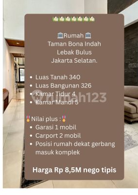 ️Rumah Taman Bona Indah Lebak Bulus Jakarta Selatan. Luas Tanah 340 Luas Bangunan 326 Kamar Tidur 4 Kamar Mandi 5 ️Nilai plus :️Garasi 1 mobil Carport 2 mobil Posisi rumah dekat gerbang masuk komplek Harga Rp 8,5M nego tipis