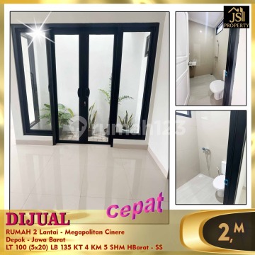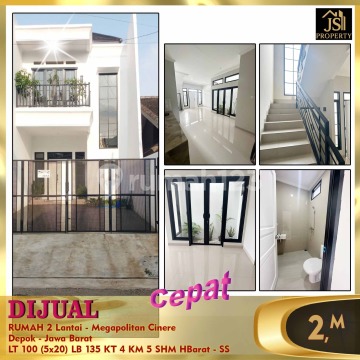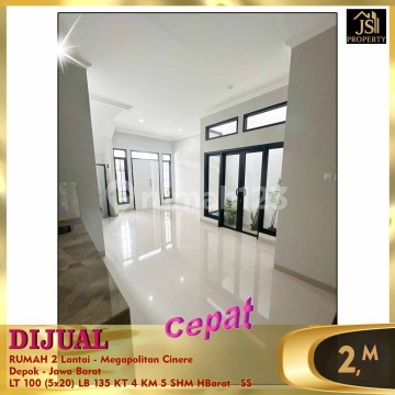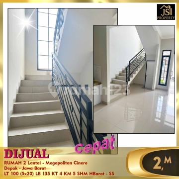 DIJUAL RUMAH 2 Lantai - Megapolitan Cinere Depok - Jawa Barat Bebas Banjir 1 menit ke tol Krukut 1 menit ke New South City 7 menit ke Pasar Segar, Grand Lucky, Informa 10 menit ke TB Simatupang Luas Tanah 100 m² Dimensi 5x20 m² Luas Bangunan 135 m² 2 Lantai Kamar Tidur 3+1 Kamar Mandi 4+1 Full Furnish : Tidak Listrik 2.200 Watt Air PAM Sertifikat SHM Hadap Barat Harga 1,95M Nego - SS