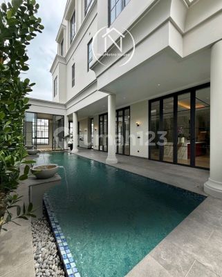 RUMAH SIAP HUNI BRAND NEW HOUSE Luas Tanah 338 m2 (fisik 370 m2) Luas Bangunan 810 m2 Bangunan 4 lantai + Semi Rooftop Kamar Tidur 4 Kamar Mandi 4 Powder Room 2 Swimming Pool Private Lift Salon & Massage Room 1 Dry & Wet Kitchen Service Area Garasi 4 mobil Carport 2 mobil