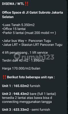 DISEWA / WTL‼ Office Space di Jl Gatot Subroto Jakarta Selatan -Luas Tanah 5.350m2 -Office 15 lantai -Parkir 5 lantai (muat 200 mobil ++ ) -Jalur bus Way = Pancoran Tugu -Jalue LRT = Stasiun LRT Pancoran Tugu 4 lift penumpang , 1 lift service Terdiri dari 40 m2 - 1.896m2 Unit 1 : 165.02m2 furnish Unit 2 : 948.43m2 bare (full 1 lantai) tersedia 2 lantai atas bawa bisa d connecting menggunakan tangga Unit 3 : 633.33m2 - semi furnish Harga 170.000/m2/bulan #shelsherliGpproperty #julianproperty #julianproperty