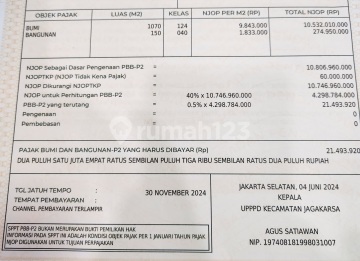High Return Lokasi Strategis Pinggir jalan raya kawasan elit jagakarsa, transportasi lengkap Luas Lahanya 1070 M2 Sertifikat Hak milik. sudah ada bangunan kos kosan 22 unit dan juga Bangunan 3 unit Ruko. *** *Penghasilan Kos- kosan* Perbulannya dari Rp 1.800.000 Sampai Rp 2.200.000. PerSatu kamarnya. Total Kos kosannya Ada 22 kamar. Harganya Kita pukul Rata Rata persatu kamar kos kosan perbulannya Rp 2.000.000 X 22 kamar = Rp 4400xxxxperbulannya) Rp 44.000.000 X 12 bulan = Rp 52800xxxxpertahunnya) *** *Penghasilan 3 unit Ruko* Kontrak Satu Ruko Pertahunnya Rp.95 juta. ini ada 3 bangunan Ruko. Rp 95 juta X 3 Ruko = Rp 285 juta. TOTAL PENGHASILANNYA ATAU PEMASUKAN dari kos kosan dan Tiga unit Ruko Rp 813.000.xxx,- Pertahunnya