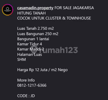 Luas Tanah 2.750 m2 Luas Bangunan 250 m2 Bangunan 1 lantai Kamar Tidur 4 Kamar Mandi 2 Halaman Luas SHM Harga Rp 12 Juta / m2 Nego More Info 08121217xxxx CODE : JD